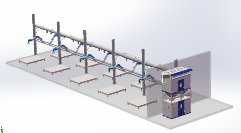 在涂裝生產(chǎn)線現(xiàn)場分散布置有5套廢溶劑收集裝置,1套分布于中涂線(包括8臺機器人和10個手工噴漆點),2套分布于面漆色漆線(包括8臺機器人和16個手工噴漆點)